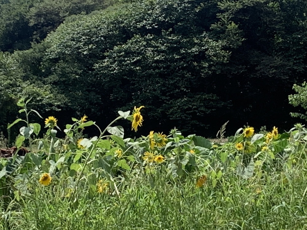 今年の大雨の災害では、私の住む福岡県宗像市周辺でも甚大な被害がありました。いつも通る道が封鎖され、警察の方々が川に流された方を暑い中に川の中で捜索されている姿を見て、私には今何ができるのだろうかと考えました。車で迂回した道を進むと、大雨に打たれてしなだれている向日葵の群生を見つけました。その中に、数本上を向いて青空に向かい凛と咲いている向日葵を見つけ、思わず写真を撮りました。その向日葵を見ていると、「がんばれよ」と父に言われているように感じました。